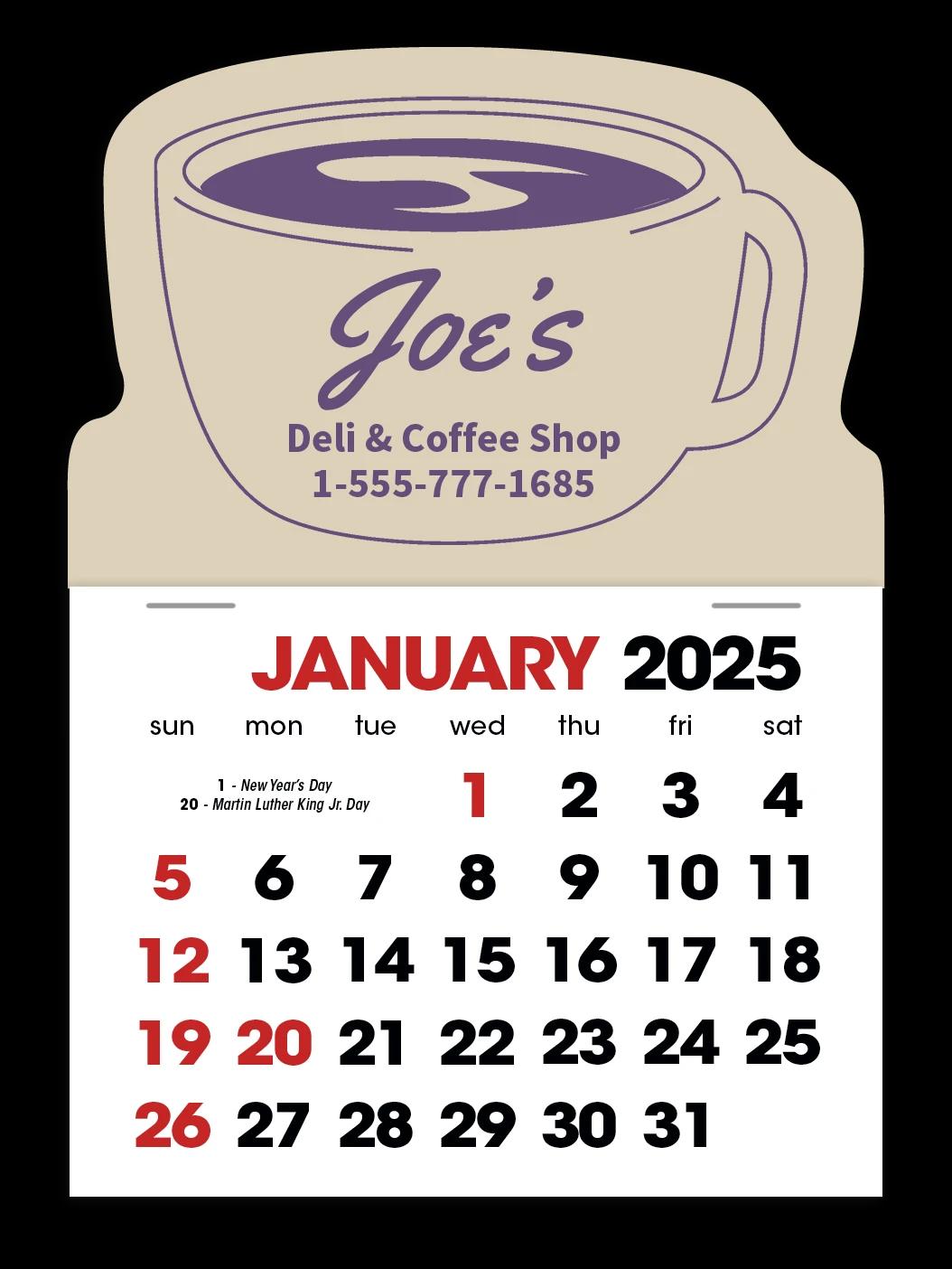 Looking for an effective advertising tool for your business? Look no further than the Coffee Cup Stick Up Calendar from SuperiorPromos.com. This 2024 calendar is perfect for promoting your business, offering 8 different date-grid options to suit your needs. The imprint is located prominently on the vinyl mount, right at the top of the date-grid, ensuring your business logo or message is always visible. Don't miss out on this opportunity to keep your brand in front of customers all year long.