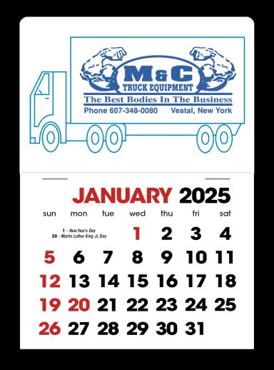 The 2024 Semi-Truck Stick Up Calendar from SuperiorPromos.com is perfect for advertising your business. Featuring eight different date-grid options, this customizable calendar ensures you find the perfect fit for your branding needs. The imprint is prominently displayed on the vinyl mount, right above the date-grid, making your business logo or contact information highly visible. This practical and versatile calendar is designed to stick onto surfaces easily, providing year-round promotional benefits for your company.